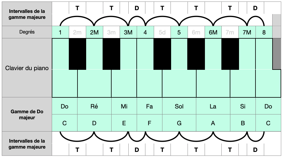 Voici l'illustration des degrés sur le clavier du piano. Dans ce cas le degré 1 coïncide avec la note Do.