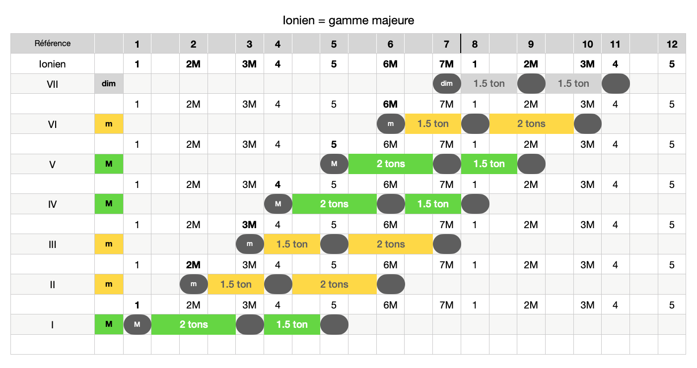 Voici par exemple mon interprétation de l'harmonisation de la gamme majeure illustrant ses triades majeures, mineures et la diminuée: