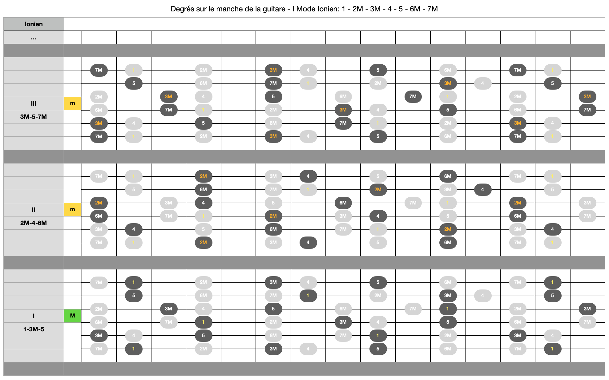 Les pastilles en gris foncé indiquent les notes des triades, celles en gris clair indiquent les autres notes de la gamme. Le 1 est toujours écrit en jaune pour rappeler la tonique de la gamme. Le numéro orange correspond à la fondamentale de la triade.