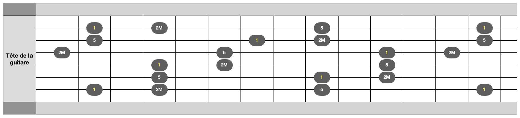 Les degrés de la triade sus2 sur le manche de la guitare: